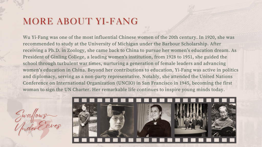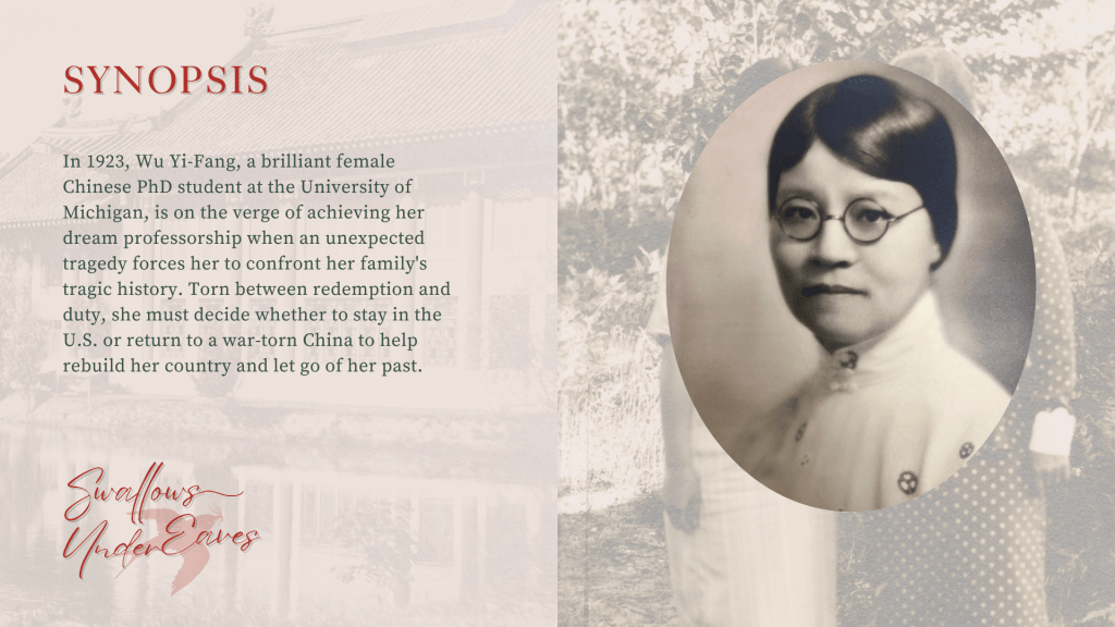 “Swallows Under Eaves” is a 25-minute historical fiction film that unfolds the self-discovery journey of Wu Yi-Fang (吴贻芳), a distinguished Chinese female scholar who was recommended to study at the University of Michigan in the 1920s, later becoming the first female college president in China. This film follows how her experiences of family loss and camaraderie in Michigan led her from intending to pursue research in the U.S. to committing herself to women’s education back in China. This project was initiated as Tianyi Zhai’s senior honors thesis production project in the Department of Film and Television Media at the University of Michigan.